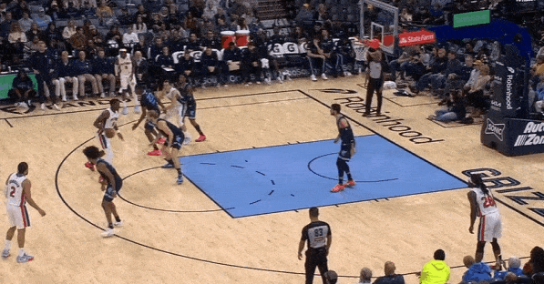 CC和格林上线“Flip”起手意图点名莫兰特,左路突破杀入油漆区吸引JJJ协防后回给幽灵区埋伏的斯图尔特,后者接球后顶着两人协防制造犯规。