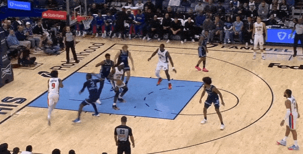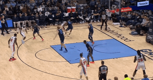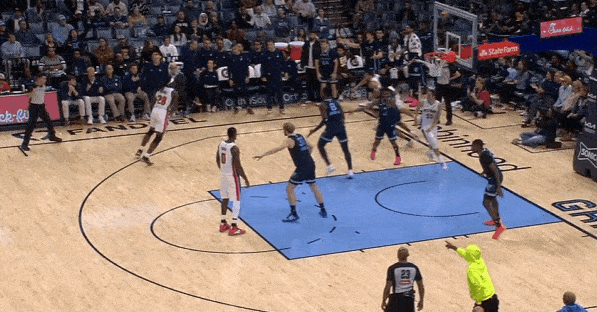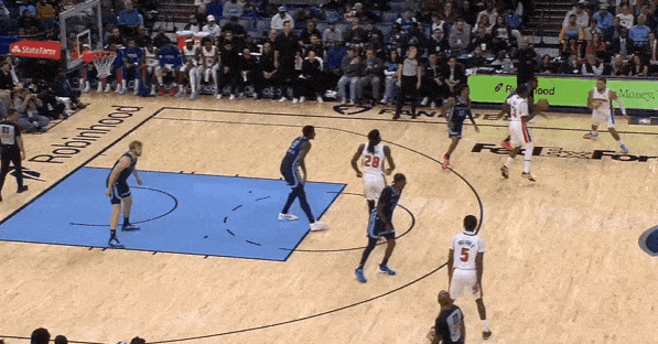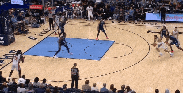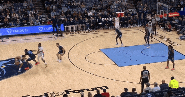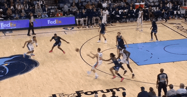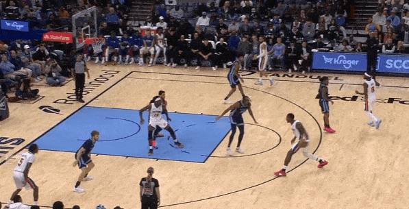 底线球回合,接发球后衔接与CC边路的手递手,前者挡拆行进间吸引JJJ上前干扰的瞬间立即回给顺下的斯图,后者扣篮得手。