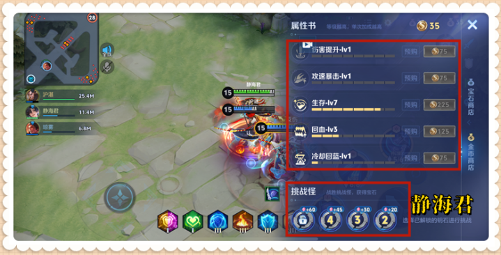 可以提升的属性有六个,分别是:伤害提升、攻速暴击、生存能力、回血能力、冷却回蓝。挑战怪的话我是发现了5种,击败后可以得到10、20、30、45、60个宝石。