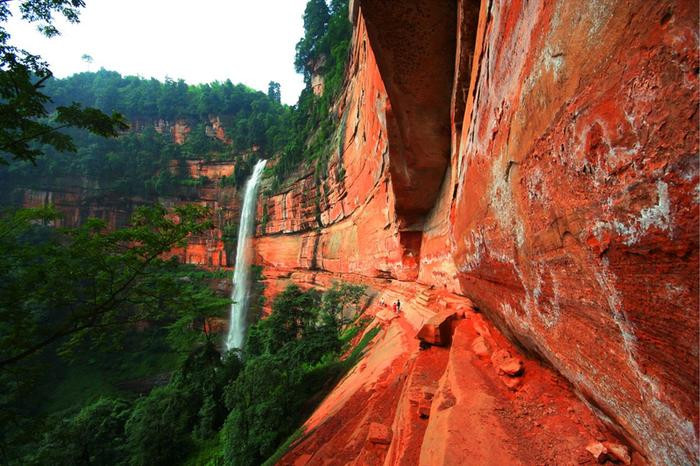 距赤水大瀑布约50公里处,佛光岩以另一种姿态诠释着大自然的鬼斧神工:1117米长的红层绝壁弧、385米的高度差。天气晴朗时,太阳辉映下,垂直矗立的岩壁呈现橙红色的光景,犹如佛光四射,故而得名“佛光岩”。