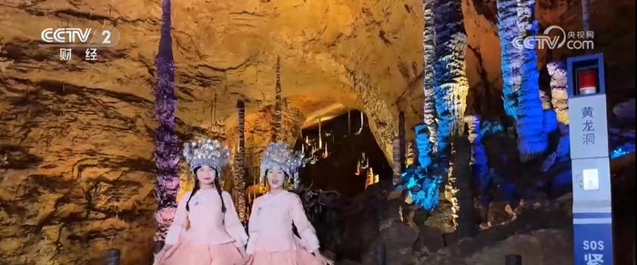 在黄龙洞地下世界,身着多民族服饰的非遗快闪队伍以溶洞为T台,进行时装秀巡游。