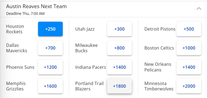 但如果里夫斯和湖人没有谈妥,最终离开这支球队呢?最新下家赔率显示,火箭(+250)已经成为他的头号热门下家,排在火箭后面的还有爵士、活塞、独行侠、雄鹿、凯尔特人等队。