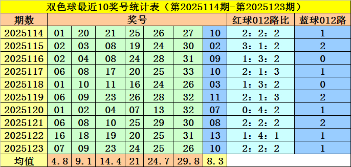 一、开奖回顾:双色球第2025123期奖号:07、09、23、24、25、26+10。 二、红球10期数据分析 从最近10期号码点位分布来看,第一位012路出号个数为3:5:2;均值为4.8,本期第一位注意均值以上的号出现,结合012路来看,本期第一位看好0路号。 第二位012路号分布为4:2:4,应注意0路号。看好12。 第三位012路号分布为1:3:6,该点位近10期均值为14.4,第25124期看好均值以下出号,关注13。 第四位均值为20.6,012路分布为2:5:3,本期应注意余数0...