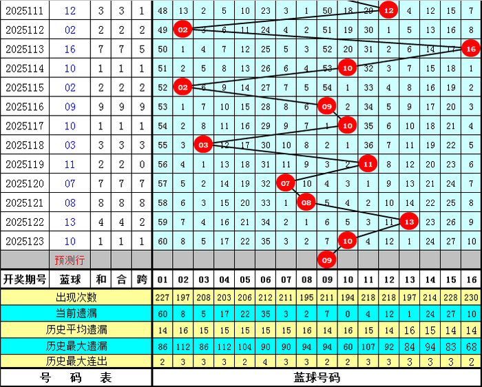 蓝球最近10期奖号走势为:10、02、09、10、03、11、07、08、13、10。蓝球均值为8.3,012路余数比例是2:5:3,本期注意余数0、2路。近10期蓝球跨度走势为6-8-7-1-7-8-4-1-5-3,本期看好蓝球跨度走小,综合这些形态来看,第25124期蓝球关注09、11、12、15,一码蓝球看好09。