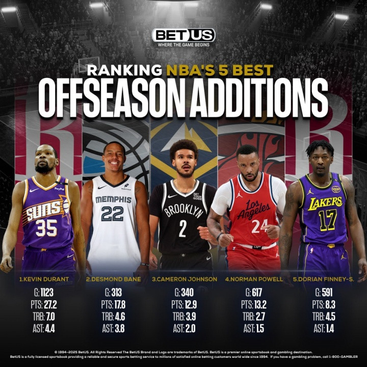 直播吧07月19日讯近日,美媒BetUSNBA评选出了今年NBA休赛期至今的五笔最佳引援,具体如下:
