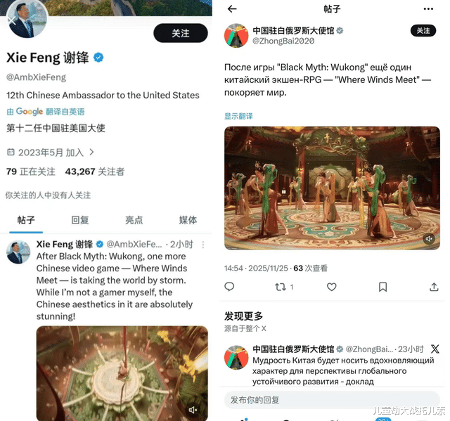 昨日,中国驻美大使谢峰和中国驻白俄罗斯大使馆相继在社交平台上发帖,对网易另一款武侠游戏《燕云十六声》的一段国风舞蹈视频夸奖了一番,称赞继黑神话悟空后,中国东方审美再次崛起。