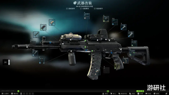尼基塔下了不少功夫让玩家们相信这套世界观的建构合理性,同时塔科夫又一直将“硬核拟真”当成招牌。比如取消直观的GPS地图设计,加入饮食系统、甲弹对抗机制、模块化血量设计,以及通过买下一大堆枪械和配件版权打造出的枪械改装功能等,这些硬核要素统合到一起,令玩家们时刻思考自己的处境和相应的对策,尽可能深化游戏的沉浸感。