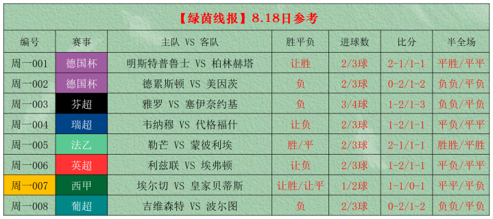 【绿茵线报】8.18日参考编号赛事主队 VS 客队胜平负进球数比分半全场周一001德国杯明斯特普鲁士 VS 柏林赫塔让胜2/3球2-1/1-1平胜/平平周一002德国杯德累斯顿 VS 美因茨负2/3球0-2/1-2负负/平负周一003芬超雅罗 VS 塞伊奈约基负3/4球1-2/1-3负负/平负周一004瑞超韦纳穆 VS 代格福什让负2/3球1-2/1-1平负/平平周一005法乙勒芒 VS 蒙彼利埃胜/平2/3球2-1/1-1胜胜/平胜周一006英超利兹联 VS 埃弗顿让负2/3球1-2/1-1平负/平平周一007西甲埃尔切 VS 皇家贝蒂斯让胜/让平1/2球1-1/0-1平平/平负周一008葡超吉维森特 VS 波尔图负2/3球0-2/1-2负负/平负