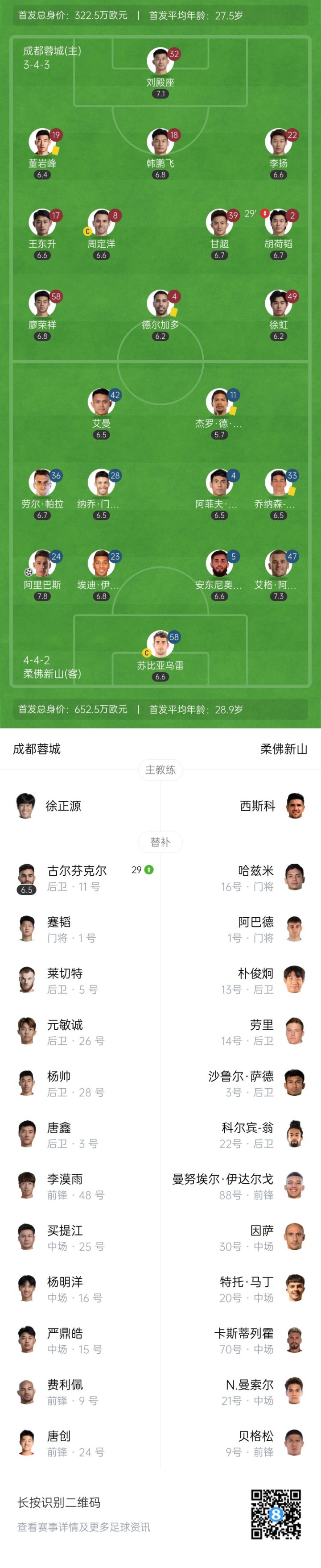 第27分钟,成都蓉城前场任意球,甘超主罚开到禁区内,李扬头球攻门顶偏了↓