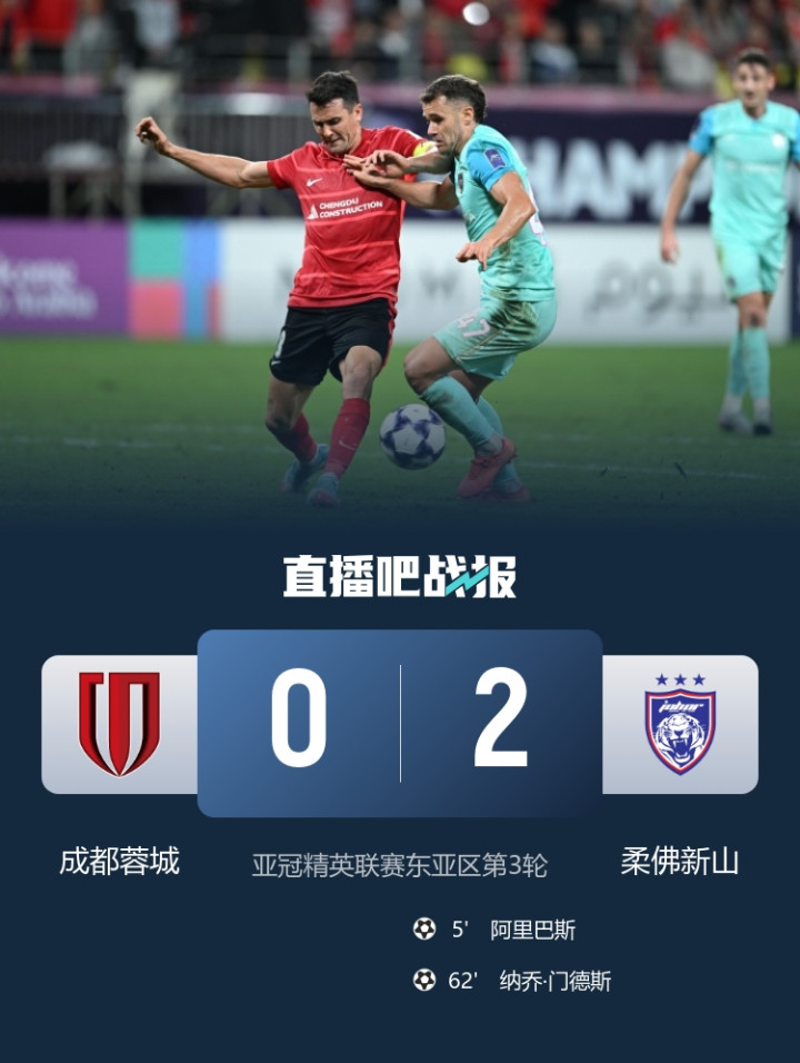 直播吧10月21日讯北京时间18:00,亚冠精英联赛东亚区第3轮,成都蓉城vs柔佛新山,比赛在五粮液文化体育中心专业足球场打响!上半场,阿里巴斯开场5分钟低射破门!胡荷韬29分钟伤退。下半场,纳乔·门德斯再下一城 [比赛关键事件] 第5分钟,柔佛新山右路攻势,阿里巴斯得球后长驱直入,从肋部杀进禁区内右侧,右脚低射破门!柔佛新山1-0领先成都蓉城↓ 第62分钟,柔佛新山左路配合,乔纳森-席尔瓦接直塞下底,挑传到禁区中央,纳乔·门德斯凌空抽射破门!成都蓉城0-2落后柔佛新山↓ [比赛焦点瞬间] 第...
