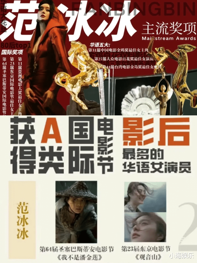 实际上,范冰冰入行以来,除了此前获得过东京电影节影后。还获得多个国籍大奖,也亚洲大奖。而在国内的顶级奖项中,范冰冰曾凭借《手机》获得27届百花奖影后。凭借《我不是潘金莲》获得31届金鸡奖影后。在那个时代,范冰冰也是获得A类国籍电影节影后最多的华语女演员。而如果不是后面做错了事情。可能近几年早就拿下三金影后 了。