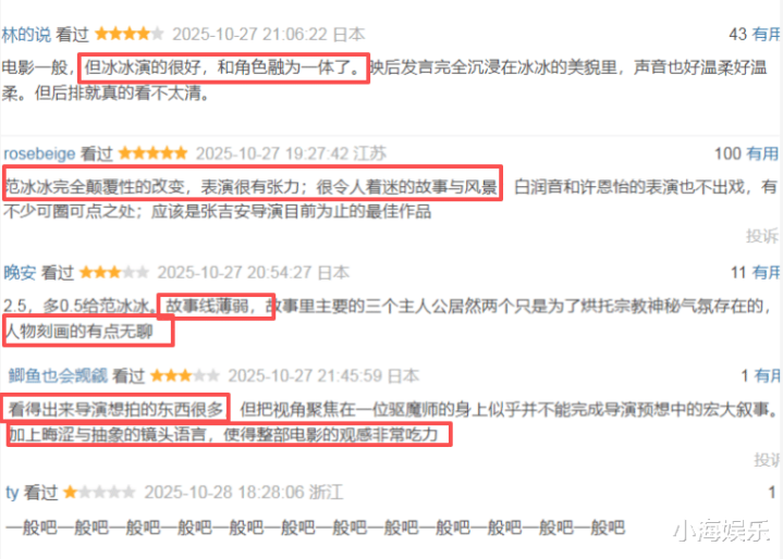 而《地母》在东京电影节展映后的口碑也是出现了两极分化,一部分网友故事和风景都很迷人,张吉安目前为止最好的电影,而范冰冰的演技也被 广泛夸赞,认为其和角色已经融为一体。不过也有网友吐槽电影故事薄弱,人物刻画无聊。导演想拍的太多,但把所有东西都聚焦在一个驱魔师身上,并不明智。而且镜头语言抽象影响观感。