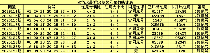 双色球第2025123期奖号为:070923242526+10,红球尾数为:345679,没有出现同尾红球。 最近10期双色球红球尾数0-9开出频次分别为:尾数6出现9个,尾数018出现7个,尾数4出现6个,尾数2359出现5个,尾数7出现4个,尾数0-9全部出现。本期注意尾数:23489,注意尾数4开出同尾红球。 第1位尾数分析:前10期尾数6开出4期,尾数1开出3期,尾数2开出2期,尾数7开出1期,尾数0、3、4、5、8、9开出0期,本期该位看好小尾出现,参考尾数2。 第2位尾数分析:前1...