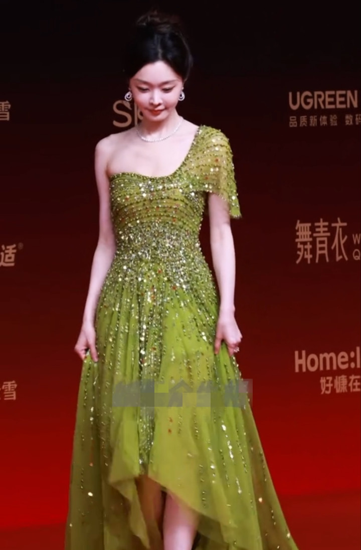为何这件绿裙在她身上如此出彩?究其根本,是肤色、气质、身形三重奏的完美协奏。冷白皮与浓郁绿色碰撞出极致高级感,纤细却不失力量感的身形撑起立体剪裁,而那份藏在眼角眉梢的灵动,更让华服有了灵魂。