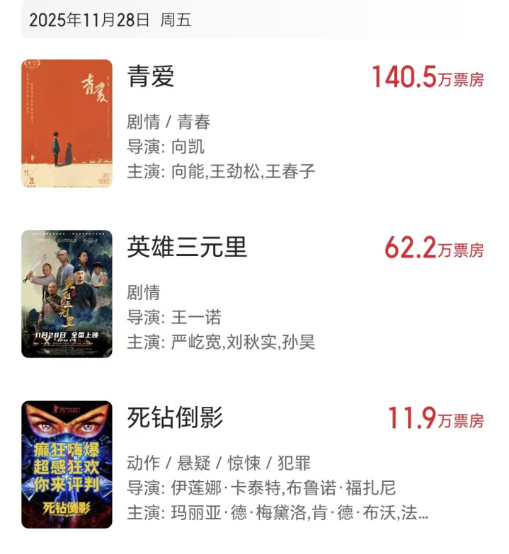 向能和王劲松联合主演的《青爱》成功夺冠,严屹宽新片《英雄三元里》票房只有60万人民币。