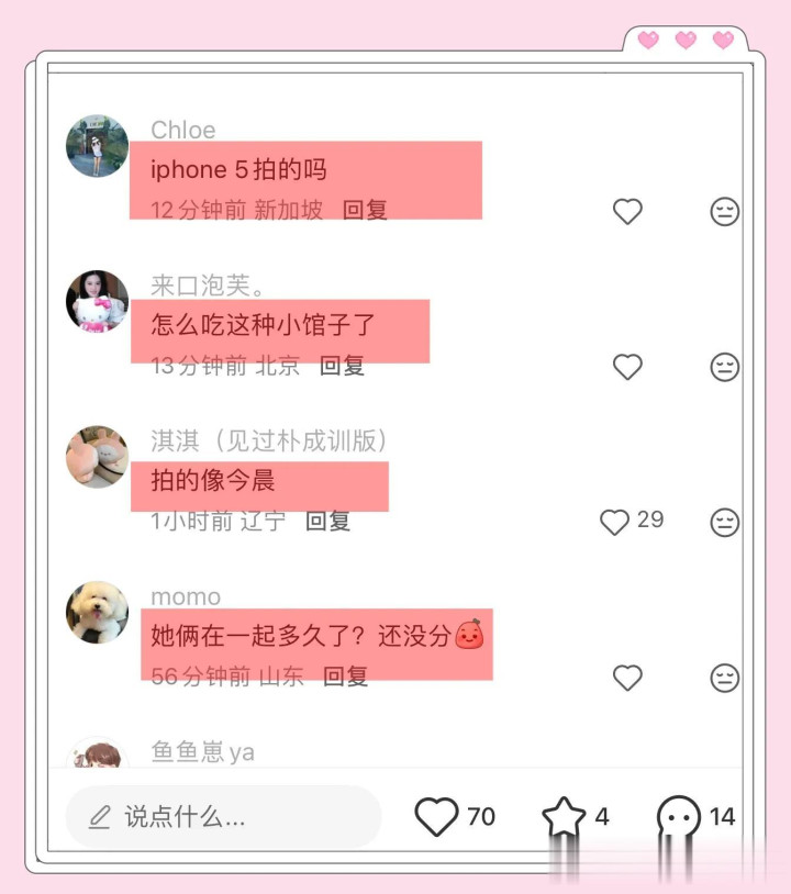 王思聪烫头了,照片虽然拍的不太清楚可是还是一眼能认出王思聪,网友吐槽偶遇的博主到底是用什么手机,懒懒一头标志性的长发,穿这黑色外套,两个人坐在一起,很甜蜜,想必看了这张照片的网友,终于信了,两个人确实没分手!他俩从去年夏天被拍到一起喂小鹿,如今已经快一年半了!